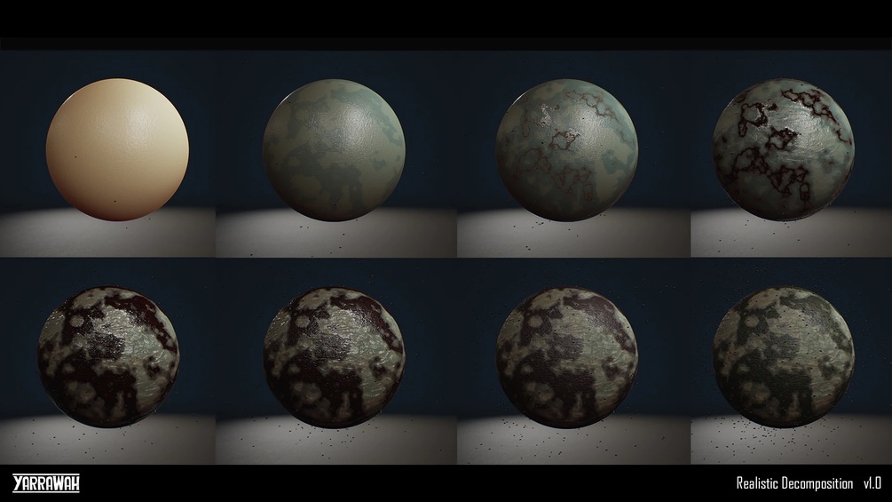 Number of Materials: 1 Master Decay Material Function, 10 Material Functions for the Decay System, 5 Particle Master Materials, 1 Unique Decomposition Decal (Additional example materials included)