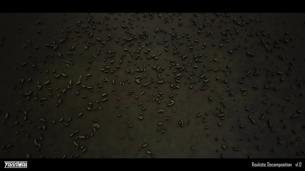 Watch your characters decay and rot over time, as flies make their home and maggots begin to spawn from the peeling flesh. The fabric will stain as the body decomposes underneath, moistening and seeping through to the surface. The skin and fabric will then begin to rot and dry out, becoming more wrinkled and decomposed over time, before fading away to ash, leaving nothing but a pile of squirming maggots.